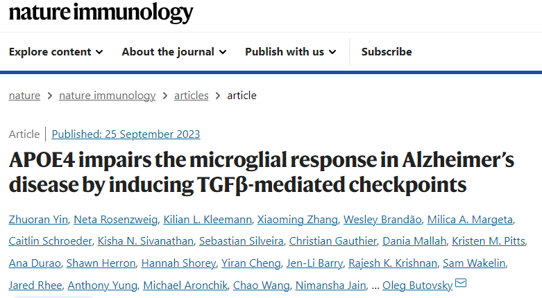 L’allèle APOE4 altère la réponse microgliale dans la maladie d'Alzheimer via un mécanisme impliquant le TGF-beta - Nature Immunology - 25 septembre 2023
