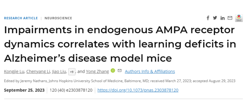 L’altération de la dynamique des récepteurs AMPA neuronaux est corrélée aux déficits d’apprentissage et à l’hyperactivation des cellules gliales dans un modèle murin de maladie d’Alzheimer - PNAS - 25 septembre 2023