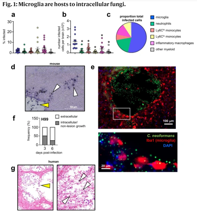Il est établi que la microglie assure une protection contre diverses infections cérébrales bactériennes, virales ou parasitaires. En revanche le rôle des cellules microgliales au cours d’infections cérébrales fongiques reste inconnu. Les auteurs de ce travail ont étudié le rôle des cellules microgliales dans un modèles murin de méningite à cryptocoque, la cause la plus fréquente de méningite fongique chez l'homme. En utilisant une série de méthodes de déplétion des cellules microglies par des approches pharmacologiques ou de transgénèse les auteurs ont constaté que, contrairement à leur rôle protecteur lors d’autres infections, la déplétion en cellules microglies n’affectait pas le contrôle de l’infection cérébrale à Cryptococcus neoformans. Ce résultat a été répliquée avec plusieurs souches fongiques. Cette étude montre également que les cellules microgliales servent de réservoir à cryptocoques aux temps précoces de l’infection cérébrale et quelles préservent les cryptocoques d’un déficit fonctionnel en ions cuivre.