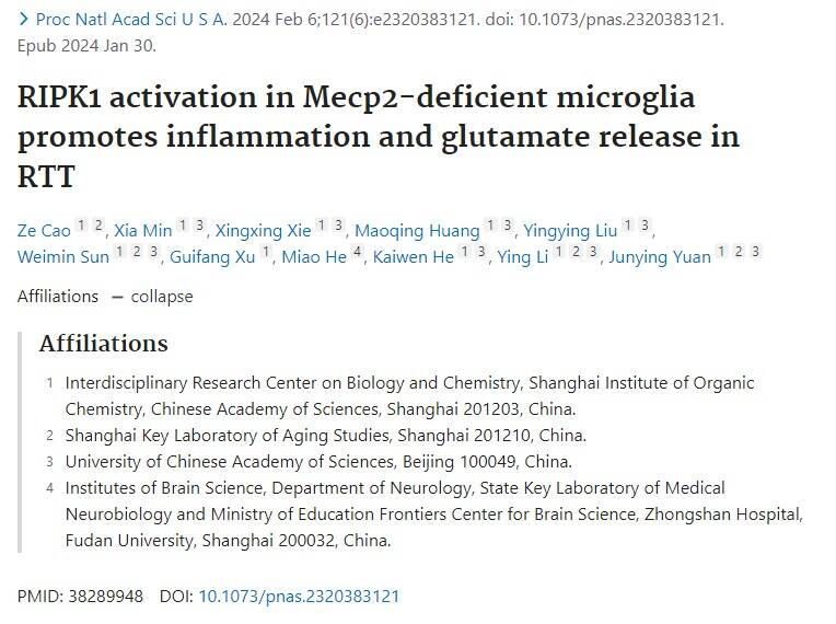 L'activation de RIPK1 dans les cellules microgliales déficientes en Mecp2 favorise l'inflammation et la libération de glutamate dans le syndrome de Rett (RTT) – PNAS - Janvier 2024