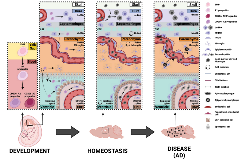 La dure-mère, les leptoméninges, l'espace périvasculaire et l'épithélium des plexus choroïdes constituent des barrières structurales à composantes cellulaires et acellulaires. Chacune de ces structures accueille des populations myéloïdes distinctes qui proviennent principalement de progéniteurs érythromyéloïdes (EMP pour « erythromyeloid progenitors » = progéniteurs capables de générer des globules rouges et des cellules immunitaires du lignage myéloïde) issus du sac vitellin (= vésicule vitelline). Ces progéniteurs colonisent le SNC durant l'embryogenèse et, selon leur localisation dans des sites micro-anatomique spécifiques, génèrent des populations macrophagiques distinctes. Ces populations diffèrent quant à leur phénotype, leur durée de vie et les modalités de leur renouvellement à partir d’éléments sanguins. En particulier, alors que certaines cellules dérivées d'EMP colonisent le parenchyme pour se différencier en cellules microgliales, d'autres s'implantent dans les méninges et génèrent des macrophages « associés » au SNC (CAM pour « CNS-associated macrophages »), également appelés macrophages associés aux bordures (BAMs pour « border-associated macrophages”). C’est le cas des macrophages leptoméningés. Chez la souris, en situation homéostatique, les cellules sanguines issues de la moelle osseuse contribuent très peu au renouvellement des macrophages méningés et des macrophages périvasculaires, mais sont indispensables au renouvellement des macrophages de la dure-mère et des plexus choroïdes. Toutefois, dans des conditions pathologiques où la barrière hémato-encéphalique est compromise, des cellules sanguines issues de la moelle osseuse peuvent coloniser le SNC et participer au renouvellement de l’ensemble des populations myéloïdes du SNC. Dans le même temps, les CAM peuvent également proliférer in situ et engager des programmes d’activation spécifiques. Ainsi, les cellules myéloïdes résidentes et infiltrantes peuvent co-exister au sein des mêmes niches anatomiques et façonner la physiopathologie de nombreuses maladies du SNC.