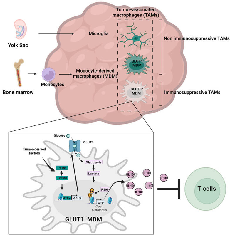 Les cellules myéloïdes suppressives (MDSCs pour «myeloid-derived suppressor cells ») restreignent la réponse immune dirigée contre les cellules cancéreuses. Différents types de cellules myéloïdes peuvent exercer ce type d’activité suppressive. Dans cet article, les auteurs ont analysé, dans un modèle murin de glioblastome (GBM), la contribution de la microglie (MG) et des macrophages dérivés de monocytes (MDMs) dans ce processus immunosuppresseur. Les MDMs se sont révélés plus nombreux que les cellules MG aux stades tardifs de la tumeur et exerçant clairement une activité inhibitrice sur l’activation des lymphocytes T. L'analyse moléculaire et fonctionnelle a identifié une population de MDMs présentant une forte activité glycolytique, exprimant GLUT1 et exerçant une puissante activité immunosuppressive. Des molécules dérivant des cellules GBM favorisent la glycolyse ainsi qu’une production de lactate et d'interleukine-10 (IL-10) par les MDMs. L'inhibition de la glycolyse ou de la production de lactate dans les MDMs altère l'expression d'IL-10 et lève l’inhibition exercée sur les lymphocytes T. Au plan mécanistique, les auteurs montrent que la lactylation des histones, stimulée par le lactate intracellulaire, favorise l'expression d'IL-10, elle-même nécessaire pour inhiber l'activation des lymphocytes T. L'expression de GLUT1 par les MDMs est induite en aval de la voie PERK - ATF4 qui est activée par des molécules dérivées des cellules GBM. Enfin, les auteurs montrent que la suppression de PERK dans les MDMs abolit la lactylation des histones, favorise l'accumulation de lymphocytes T intratumoraux et retarde la croissance tumorale.